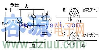 相位觸發(fā)電路實(shí)際上是交流觸發(fā)電路的一種,如圖3,這個(gè)電路的方法是利用RC回路控制觸發(fā)信號(hào)的相位。當(dāng)R值較少時(shí),RC時(shí)間常數(shù)較少,觸發(fā)信號(hào)的相移A1較少,因此負(fù)載獲得較大的電功率;當(dāng)R值較大時(shí),RC時(shí)間常數(shù)較大,觸發(fā)信號(hào)的相移A2較大,因此負(fù)載獲得較少的電功率。這個(gè)典型的電功率無級(jí)調(diào)整電路在日常生活中有很多電氣產(chǎn)品中都應(yīng)用它。
