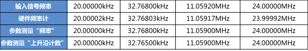 可見三者測量結(jié)果差異不大,硬件頻率計的分辨率更高,而參數(shù)測量中有效位數(shù)只有5位。此信號發(fā)生器輸出頻率的準確度為±1ppm,示波器內(nèi)部晶振的頻率準確度為±2ppm,在上述的24MHz硬件頻率計中,測量的準確度為80Hz/24MHz=3.33ppm,基本在儀器的測量精度內(nèi)。參數(shù)測量值在某些情況下顯得更接近真實值,這是因為其有效位數(shù)不夠而四舍五入的原因,準確度更高的還是硬件頻率計。