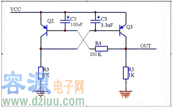 C2和c3很重要,在自鎖后,重啟電路就靠這兩個電容,否則啟動失敗。原理是上電時,電容兩端電壓不能突變,C2使得Q2基極在上電瞬間保持高電平,使得Q2不導通。C3則使得上電瞬間Q3基極保持低電平,使得Q3導通Vout有電壓。這樣R5位高電平,鎖住導通。