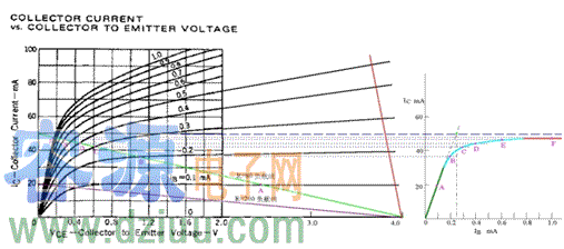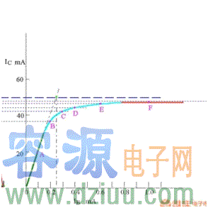 這里理解起來有些抽象,那我就具體的畫個圖,就很好理解了。在三極管截止的時候CE兩端的電壓是最大的,我們設為4.5V,在IB逐漸加大的過程中,VCE在逐漸變小,而飽和狀態下的Ic是由RC決定的,請看圖: