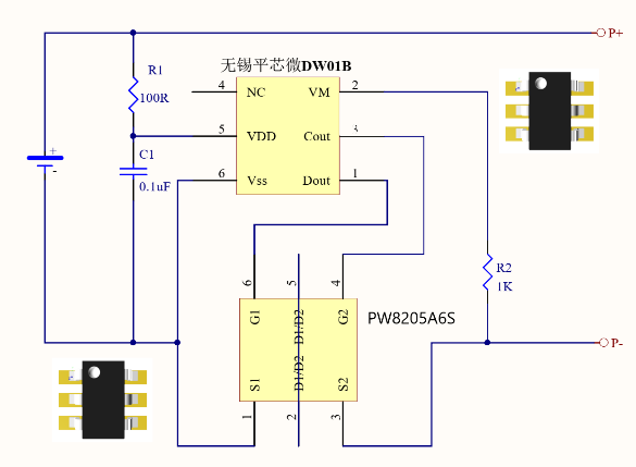 DW01B, 特點:外置MOS(PW8205A6S或者PW8205A8TS),由于是外置MOS,過充電電流和過放電電流可通過 很 多 個MOS并聯來提高,這是很常見的,采用SOT23-6封裝。