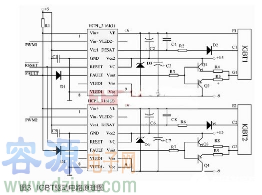 原理圖中的PWM控制信號由主控芯片DSP生成,從光耦的Vin-端輸入,同時,所有光耦使用同一個復位信號RESET。每個光耦的故障信號輸出反饋端接一個鉗位二極管(如圖3中的D1、D4),鉗位二極管陰極接光耦輸出端,所有鉗位二極管的陽極連接成一點,作為驅動模塊總故障信號FAULT。FAULT信號線又連接到所有光耦的Vin+端,同時經限流電路R1接+5V電源。系統正常工作時,光耦的Vin+端和FAULT信號線均呈現高電平,鉗位二極管處于截止狀態,PWM控制信號從Vin-端輸入到光耦內部,光耦在DSP的控制下驅動IGBT工作。