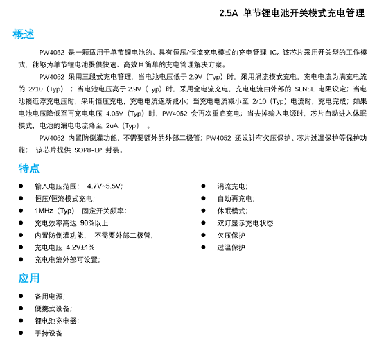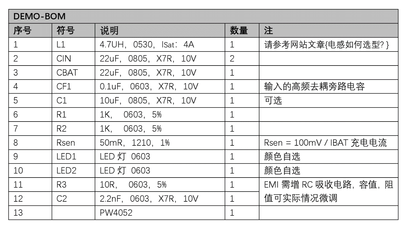 在電感這方面由于大部分是靠工程師經驗來決定的。可以按照,如表格中,PW4052最大充電電流2.5A一樣的話,電感推薦功率電感CD75-4.7uH,或者一體成型電感0530-4.7UH等。