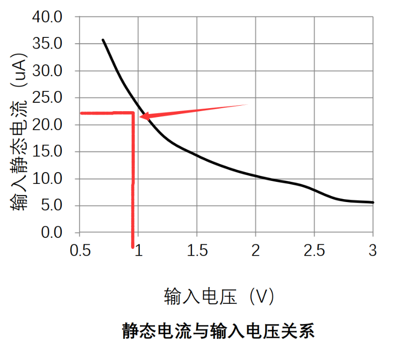 從芯片的輸入電源和輸入靜態(tài)電流的表格可以看到,1V時的靜態(tài)功耗是20uA多,隨著輸入電壓變大,靜態(tài)功耗會變小。