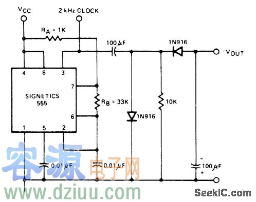 當(dāng)同時產(chǎn)生2兆赫的信號,負(fù)輸出電壓線性追蹤直流輸入電壓的時候,該電路用于從正極電源電壓得出負(fù)極電源電壓,但是幅度是大約低于3V。電流不提供調(diào)節(jié)!百惛衲崮M數(shù)據(jù)手冊” 賽格尼公