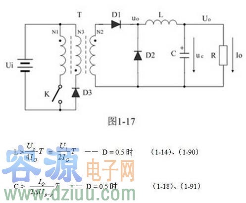 正激式變壓器開關(guān)電源電路參數(shù)計(jì)算主要對儲能濾波電感、儲能濾波電容,以及開關(guān)電源變壓器的參數(shù)進(jìn)行計(jì)算。 正激式變壓器開關(guān)電源儲能濾波電感和儲能濾波電容參數(shù)的計(jì)算 圖