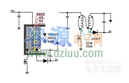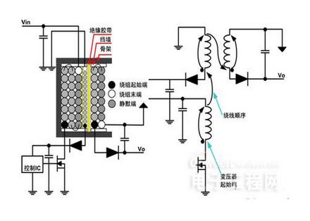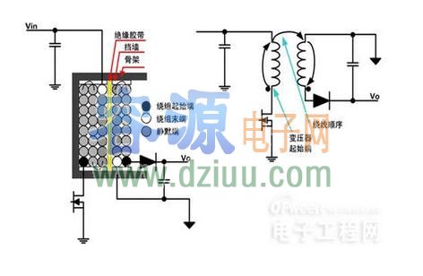 大小的dV/dt,但該dV/dt比一次側繞組的漏極相連端與絕緣膠帶相鄰時小得多。此變壓器的優點是二次側繞組的“靜默端”位于最外層,它本身就能很好的屏蔽變壓器的輻射。
