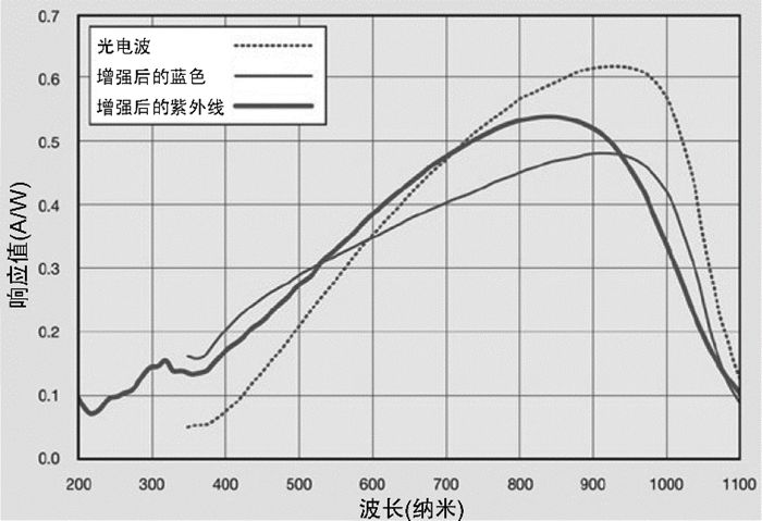 普通成像傳感器采用CCD、CMOS、BSI和Foveon方法進行制造。硅制圖像傳感器具有一個非線性的光譜響應曲線,這會很好地感知光譜的近紅外部分,但對藍色、紫色和近紫外部分就感知得不好(如圖2所示)。