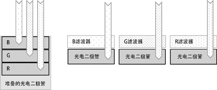 圖4:(左圖)堆疊RGB元件的Foveon方法:在每個元件位置都有RGB顏色, 并在不同的深度吸收不同的波長;(右圖)標準的馬賽克元件:在每個光電二極管上面放置一個RGB濾波器,每個濾波器只允許特定的波長穿過每個光電二極管