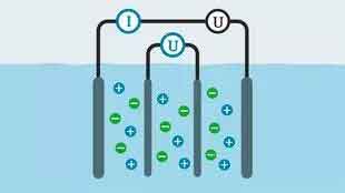 四電極電導池由2個電流電極和2個電壓電極組成,電壓電極和電流電極同軸,測量時被測液體在2個電流電極間的縫隙中通過,電流電極兩端施加了一個交流信號并通過電流,在液體介質里建立起電場,2個電壓電極感應產生電壓,使2個電壓電極兩端的電壓保持恒定,通過2個電流電極間的電流和液體電導率呈線性關系。