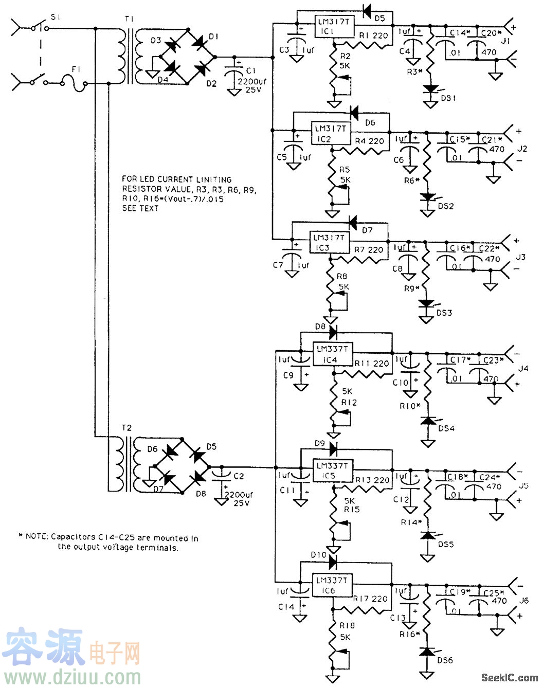 由無源線性集成電路穩壓器組成的電源能夠提供+12, +9, +5, -5, -9和-12伏的直流電。T1和T2是12伏,3安的變壓器。 :