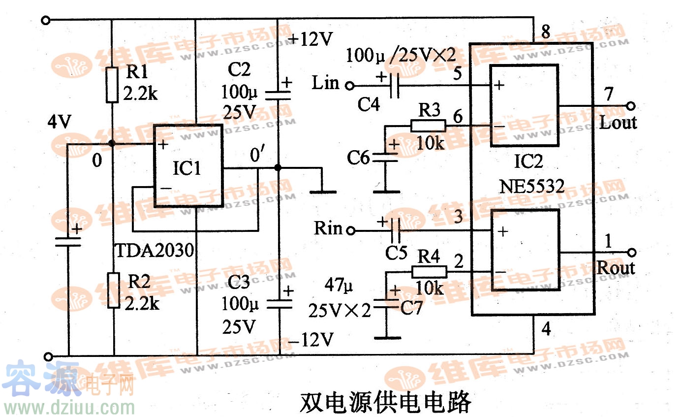 功率放大電路中的前置放大器,一般都采用雙電源供電,即對稱的正負電源供電。業余制作時,會碰到手頭無雙電源的情況,這就給制作帶來困難。本例介紹利用TDA2030將單電源轉換為雙電源給前