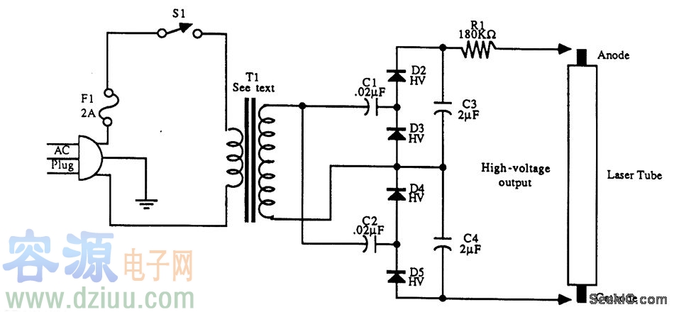 T1是一個60赫茲的120伏到1000伏升壓變壓器。C1, C2, C3, C4, D2通過D5形成一個四倍電壓。最初的電壓是4到5千伏,當激光管發光時電壓下降。 :