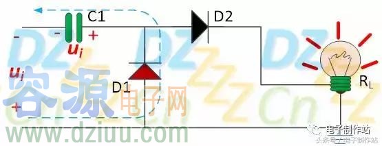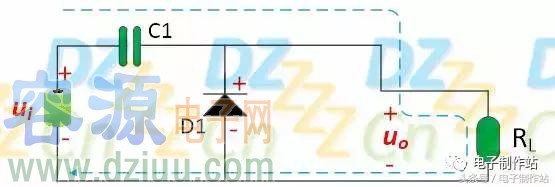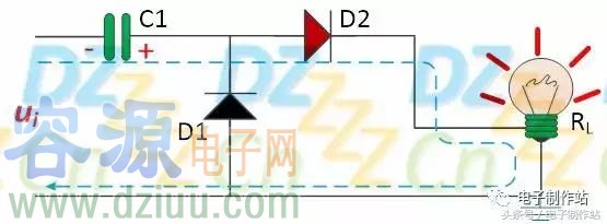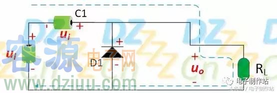 當(dāng)電壓ui的第一個(gè)正半周來到時(shí),電壓ui極性為上正下負(fù),電壓ui經(jīng)過電容C1給二極管施加反向偏置使其截止,同時(shí)給二極管D2正向偏置使其導(dǎo)通,電壓ui全部施加在負(fù)載上。