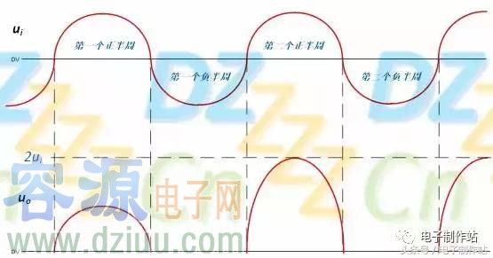 由波形圖可知,輸出電壓uo是輸入電壓ui的2倍,基于同樣的原理,也可以擴(kuò)展更高倍數(shù)的倍壓電路,這樣可以從低電壓獲取高電壓,但是倍壓整流電路輸出的電流小,不適合輸出聯(lián)接重負(fù)載的情況(也就是大電流輸出的場(chǎng)合)