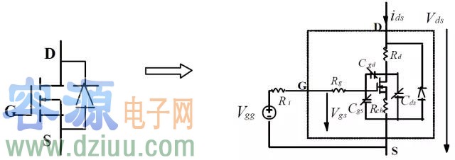 實際的功率MOSFET 可用三個結電容,三個溝道電阻,和一個內部二極管及一個理想MOSFET 來等效。三個結電容均與結電壓的大小有關,而門極的溝道電阻一般很小,漏極和源極的兩個溝道電阻之和即為MOSFET 飽和時的通態電阻。