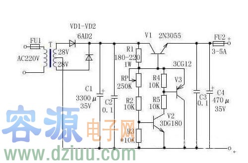左側(cè)(輸入AC)是220伏(初級)18伏(次級)/ 3安培主電源變壓器的次級。來自其次級變壓器的18伏交流電壓由二極管D1,D2,D3和D4整流,這些二極管
