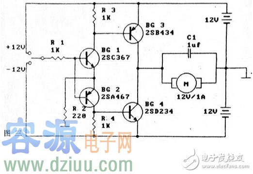 圖1電路利用了達林頓《www.flswjt.cn》晶體管擴大電機驅動電流,圖示電路將BG1的5A擴流到達林頓《www.flswjt.cn》復合管的30A,輸入端可用低功率邏輯電平控制。上述電路采用的驅動方式屬傳統的單臂驅動,它只能使電機單向運轉,雙臂橋式推挽驅動可使控制更為靈活。
