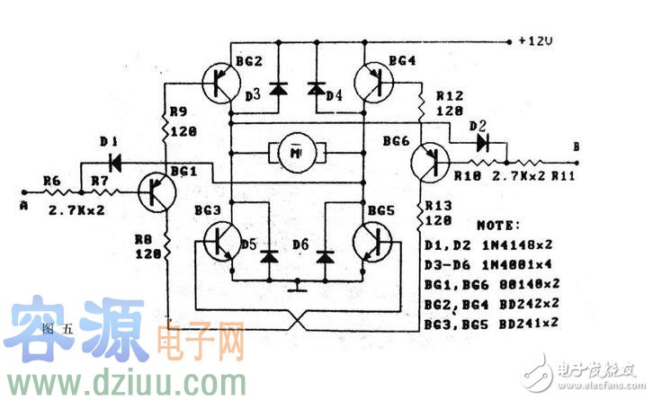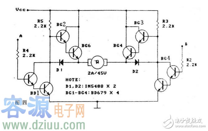圖4電路以達林頓《www.flswjt.cn》管為基礎驅動電機的正反轉,它由完全對稱的兩部分組成。當A、B兩輸入端之一為髙電平,另一端為低電平時,電機正轉或反轉;當兩輸入端同為高或低電平時,電機停轉;如采用脈寬調制,則可控制電機的轉速,因此圖4具有四種組合輸入狀態,電機卻可以產生五種運行狀態。這里箝位二極管D1、D2的加入具有重要的作用,它使達林頓《www.flswjt.cn》管BG2,BG3不會產生失控,這在大功率下運轉時更顯安全。本電路的另一特點是輸入控制邏輯電平的高低與電機的直流工 作電壓無關,用TTL標準電平就能可靠地控制。