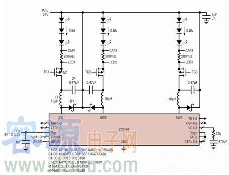 三路輸出LED驅動共陽極LED串電路分析及浪涌電流防護方
