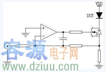運放組成基本的反向運算電路,驅動vdmos管的柵極,漏源電流通過vdmos管源極取樣電阻,加到運放反向輸入端,與輸入波形相加形成反饋,運放輸出電壓控制vdmos管的柵極電壓vgs,進而控制漏極輸出電流ids[3]。這個ids就是施加給待測二極管(dut)的正向浪涌電流。