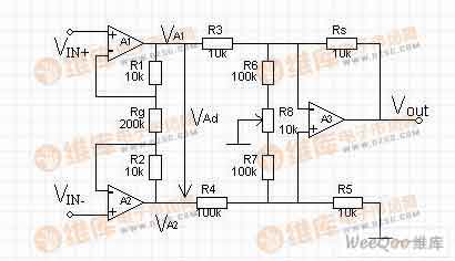 傳感器轉換放大測試電路 由運算放大器A1和A2構成第Ⅰ級,由運放A3構成第Ⅱ級。各運放一般是高性能放大器,例如低漂移高精度運算放大器OP—07。把被放大信號的兩端Vin+和Vin-分別接到A1和