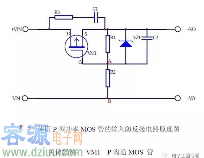 VZ1為穩壓管防止柵源電壓過高擊穿mos管。NMOS管的導通電阻比PMOS的小,最好選NMOS。
