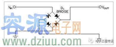 圖2 是一個橋式整流器,不論什么極性都可以正常工作,但是有兩個二極管導通,功耗是圖1的兩倍
