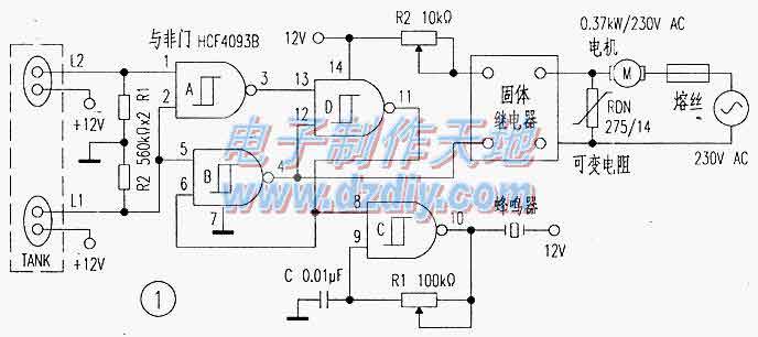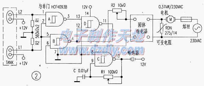 當(dāng)水箱為空時,傳感器L1與L2和門D都為低電平,因為門B和A的輸出為高。當(dāng)水位上升,將+12v通過L1短接時,門的輸出保持不變。當(dāng)水位再升高,+12v通過L2短接時,門A的輸出變?yōu)榈停归TD達(dá)到高電平。這一動作將門B的輸出鎖存為低。門B的輸出低電平拉低了SSR(固態(tài)繼電器),從而啟動水泵。同時,門D的高輸出電平啟動了門控的振蕩器,使壓電蜂鳴器發(fā)聲。