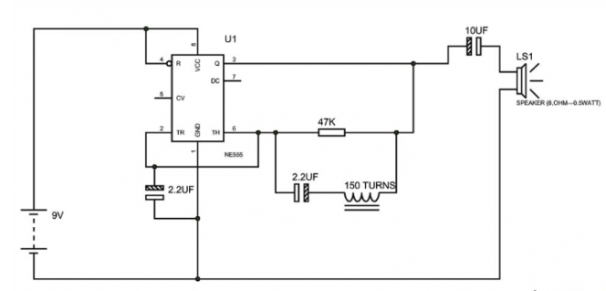 555定時器在此處的作用為方波生成器,它會生成人可以聽見的脈沖頻率。引腳1和引腳2之間的電容不應改變,因為它需要用來生成人可以聽到的頻率。