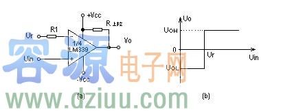 圖3為某儀器中過熱檢測保護電路。它用單電源供電,1/4LM339的反相輸入端加一個固定的參考電壓,它的值取決于R1于R2。UR=R2/(R1+R