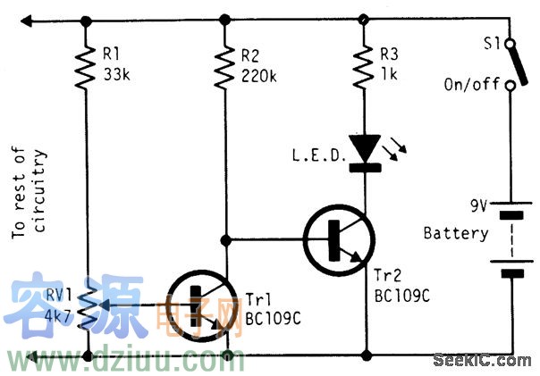 使用過程中持續監控電池電壓,僅消耗約250pA(直到到達終點)。接近終點時TR1關斷,使TR2打開LED,電流消耗進一步增加導致了明確關閉點。 :