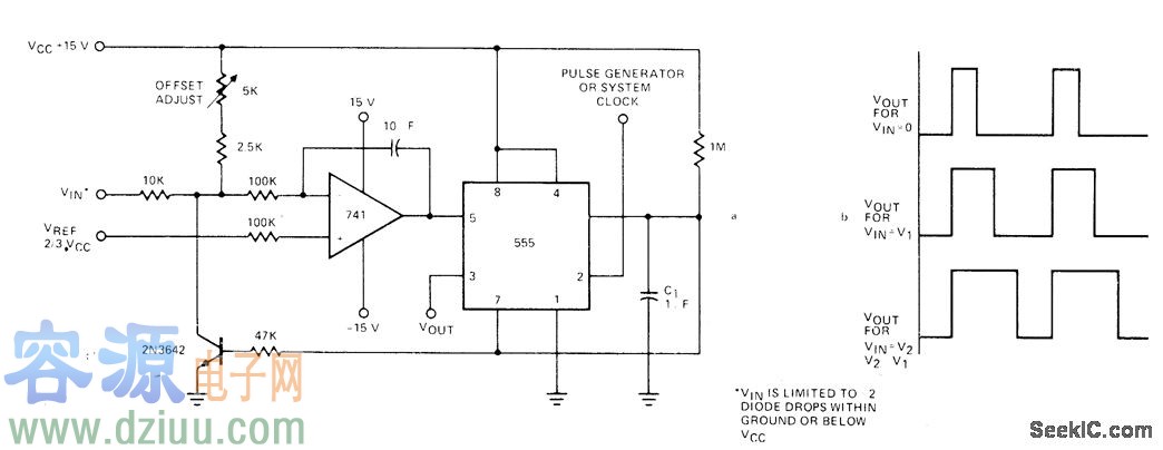 運算放大器和定時器一起轉換輸入電壓水平到脈沖輸出的寬度,并且帶有優于1%的精確。輸出的頻率與輸入是相同的。--賽格尼公司桑尼維爾,CA,1977年,P726-727。 :