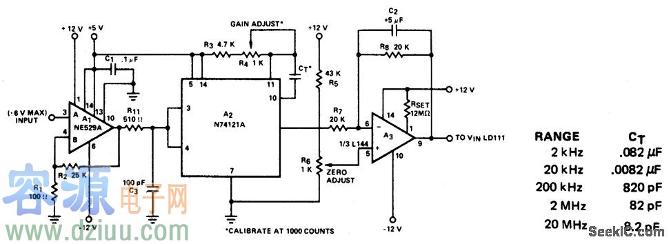 LM331頻率—電壓轉換電路(10kHz全范圍,±0.006%非線性)