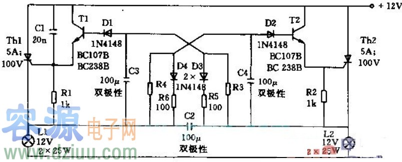 由Q1,Q2和U1組合的磁滯振蕩器,可用來穩定燈的照明。在操作時,全波電橋D3既可用于交流線中,或者是燈的未經調節的直流電,又可用于為四CMOS斯密特觸發器供電的10V齊納二極管中。 :