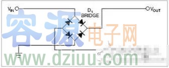 圖2 是一個橋式整流器,不論什么極性都可以正常工作,但是有兩個二極管導通,功耗是圖1的兩倍。
