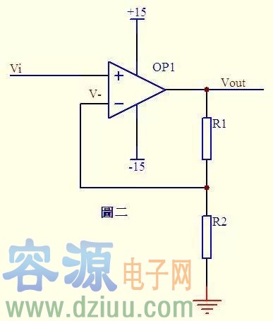 由abc式得Vout=Vi*(R1+R2)/R2 這就是傳說中的同向放大器的公式了。