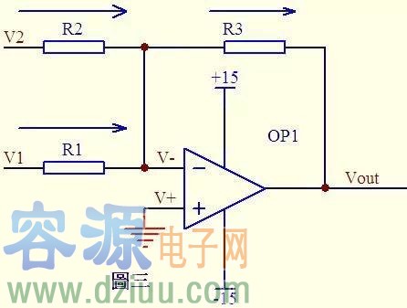 代入a式,b式變?yōu)閂1/R1 + V2/R2 = Vout/R3 如果取R1=R2=R3,則上式變?yōu)?Vout=V1+V2,這就是傳說中的加法器了。