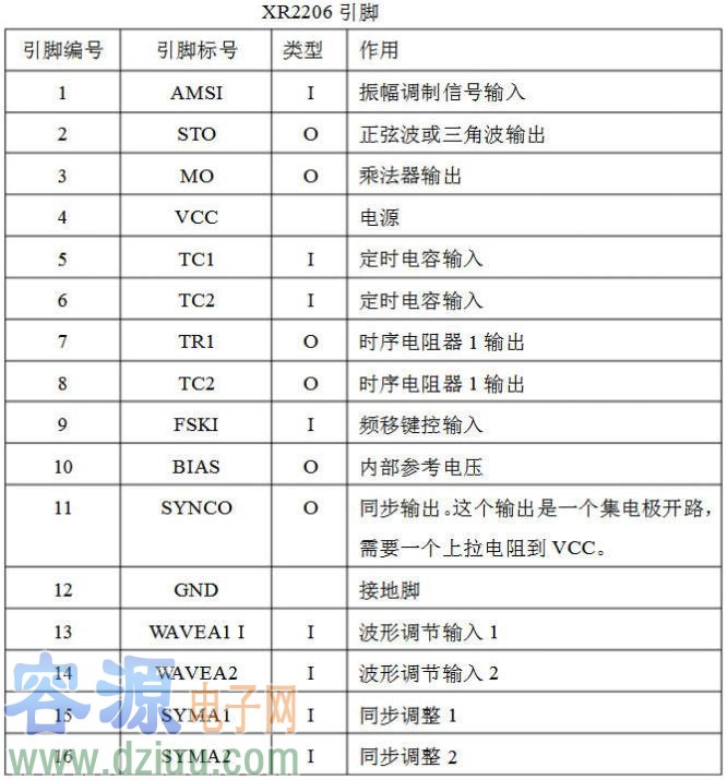 XR2206常用于函數信號發生電路中,比如正弦波,三角波,方波等等。下面介紹芯片的引腳功能:" />