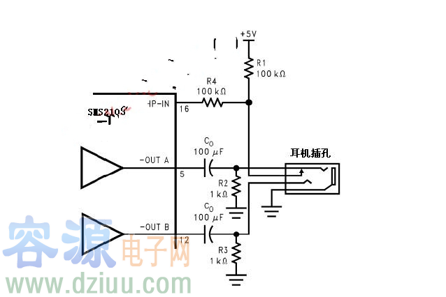 圖是耳機(jī)插孔的電性連接關(guān)系示意圖,插孔為一組三線插頭的設(shè)計,尖端和環(huán)分別為立體雙聲道的一個信號輸出,然而最外端的環(huán)為地。當(dāng)連接耳機(jī)時有一個控制端連接的耳機(jī)插孔足以驅(qū)動HP-IN管腳。一個微處理器或開關(guān)可以代替耳機(jī)插孔中連接控制端的功能,微處理器或開關(guān)向HP-IN提供4V~VDD的電壓,這樣連接揚(yáng)聲器的橋式模式便停止工作且Amp1A和Amp2A分別驅(qū)動耳機(jī)的左、右聲道。