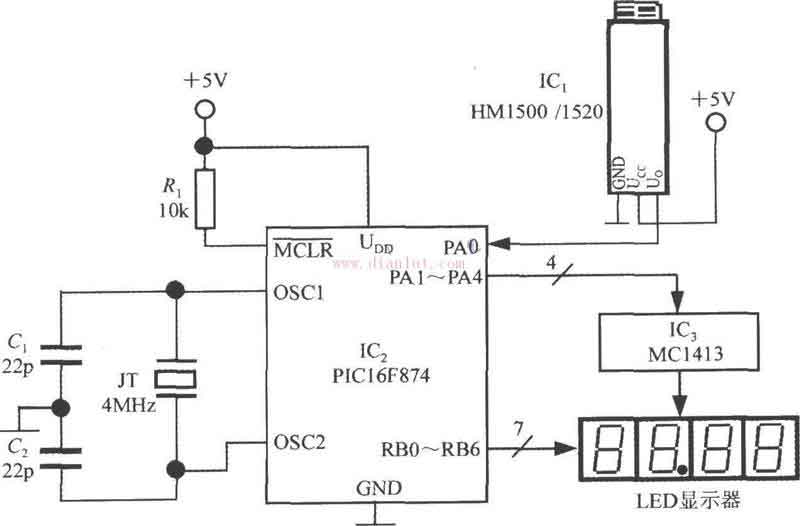 基于PIC16F874設(shè)計(jì)的電壓輸出式集成濕度傳感器電路如圖。 該儀表采用+5V電源,配4只共陰極LED數(shù)碼管。 電路中共使用了3片IC:IC1為HM1500/1520型濕度傳感器,IC2是由美國(guó)微芯片公
