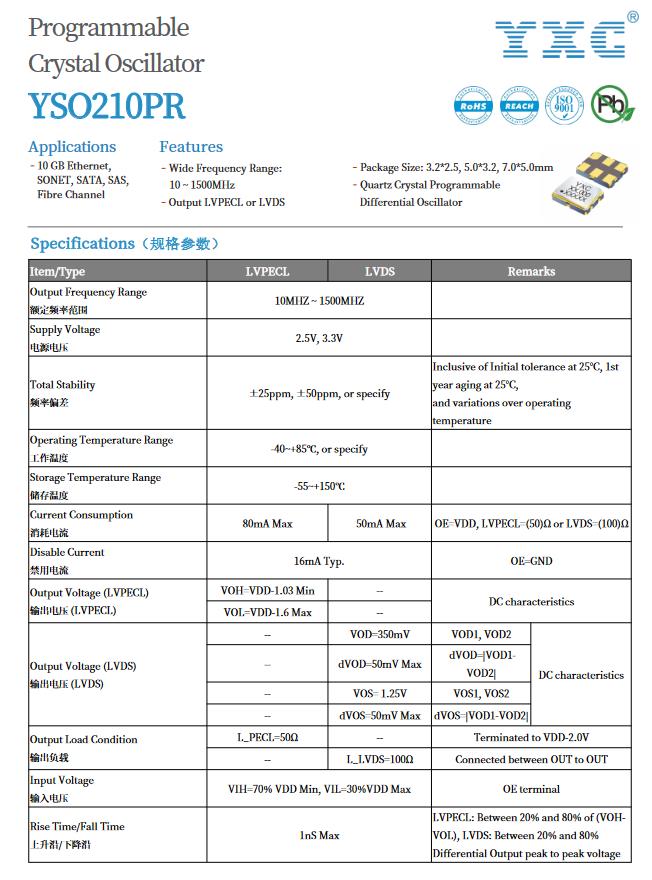 YXC晶振YSO210PR系列,頻率為10~1500MHz,封裝尺寸多種可選:3.2x2.5/5.0x3.2/7.0x5.0,以下為YSO210PR系列規格書。