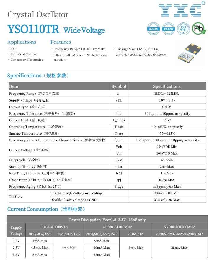 YXC石英振蕩器,頻點(diǎn)16MHz,工作電壓1.8V-3.3V,應(yīng)用于