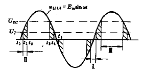 當輸入端未加電壓信號時,光耦合器的光敏晶體管因未接收光而截止,V1飽和,V3和V4因無觸發電壓而截止,此時SSR關閉。當加入輸入信號時,光耦合器中的發光二極管發光,光敏晶體管飽和,使V1截止。此時若V3兩端電壓在-(10~25)V或10~25V范圍內時,只要適當選擇分壓電阻R4和R5,就可使V2截止,這樣使V3觸發導通,從而使V 4的控制極上得到從R6→UR→V 3→UR→R7或反方向的觸發脈沖,而使V4導通,使負載接通交流電源。而若交流電壓波形在圖2中的Ⅲ區內時,則因V2飽和而抑制V3和V4的導通,而使SSR被抑制,從而實現了過零觸發控制。由于10~25V幅值與電源電壓幅值相比可近似看作“零”。因此,一般就將過零電壓粗略地定義為0~±25V,即認為在此區域內,只要加入輸入信號,過零觸發型AC—SSR都能導通。