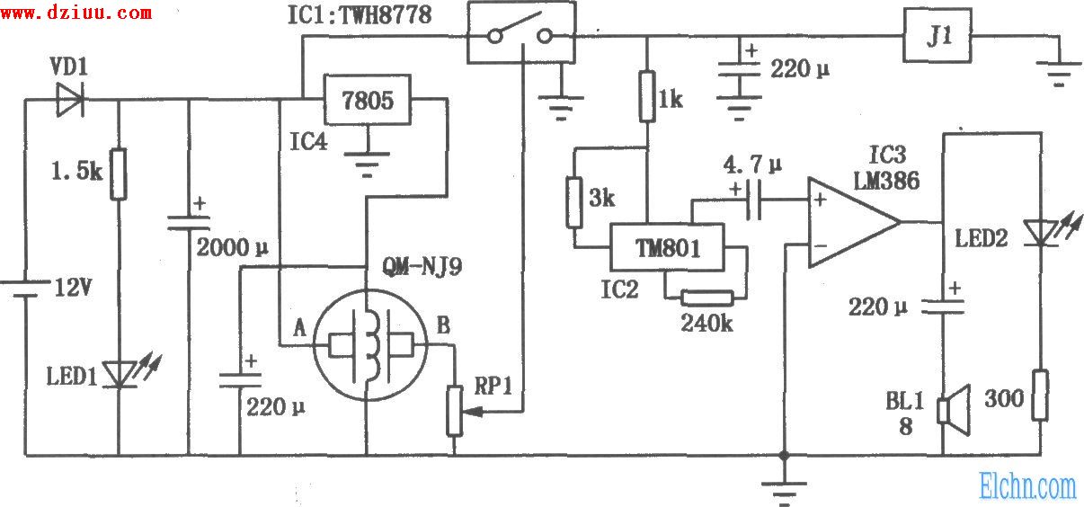 當該電位升高到l.6V時,ICl大功率開關器件TWH8778接通,使IC2語音集成電路TM801工作,其輸出經IC3集成功放LM386進行功率放大后推動揚聲器BLl發出報警聲。本文由www.flswjt.cn整理提供,部分內容來源于網絡,如有侵犯到你的權利請與我們聯系更正。
