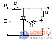 1. 可控硅應(yīng)用電路_直流可控硅觸發(fā)電路:如圖G2是一個(gè)電視機(jī)常用的過壓保護(hù)電路,當(dāng)E+電壓過高時(shí)A點(diǎn)電壓也變高,當(dāng)它高于穩(wěn)壓管DZ的穩(wěn)壓值時(shí)DZ道通,可控硅D受觸發(fā)而道通將E+短路,使保險(xiǎn)絲RJ熔斷,從而起到過壓保護(hù)的作用。