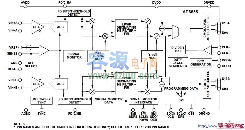 AD6655功能框圖: <<版權(quán)聲明:本文由容源電子網(wǎng)(www_dziuu_com)整理提供,部分內(nèi)容來(lái)源于網(wǎng)絡(luò),如有侵犯到你的權(quán)利請(qǐng)與我們聯(lián)系更正。》