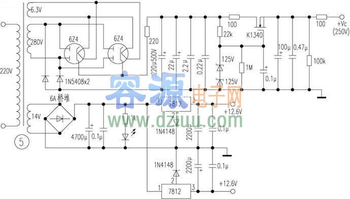 圖5是一款簡單易制、性能出眾的膽機穩壓電源。該線路結合了電子管與晶體管的特點,取長補短,