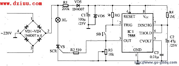VS是晶閘管,控制燈的亮、滅。其工作原理是:白天當光線照射到光敏電阻RG時,其阻值變得很小,按動按鈕SB,7555的2端不能產生幅度低于VCC/3的觸發(fā)負脈沖,故不能使7555的3端輸出高電平來觸發(fā)VS使它導通,電燈HL不亮。晚上:RG阻值變大,當按按鈕SB時,7555的2端產生了低于VCC/3的低電平脈沖,從而使7555定時器的3‘端輸出約50s(