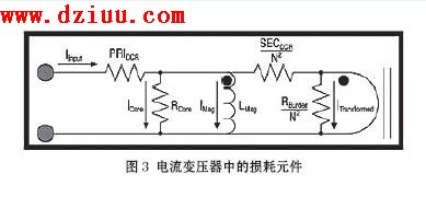 我們應注意到圖3電路中的四個損耗功率的元件:初級回路的電阻(PRIDCR)、磁心損耗電阻(Rcore)、次級的DCR(RDCR)被減小為1/N2。這些損耗影響著電流源(I)。電阻對電流變壓器的精度具有間接影響。